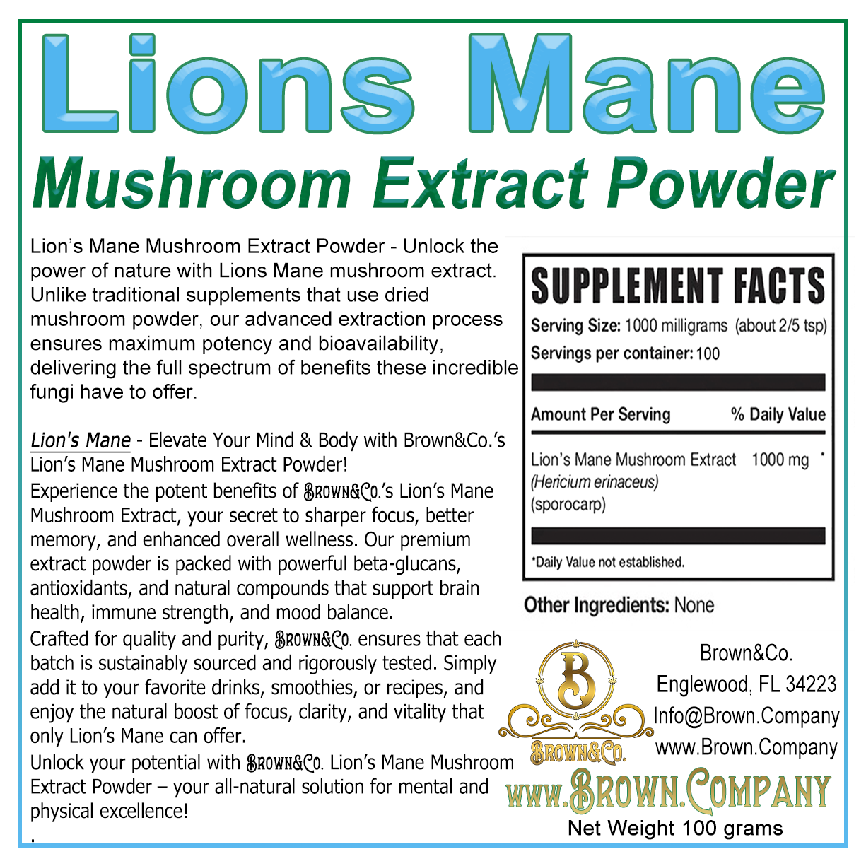 Each 100-gram bag offers a convenient, long-lasting supply to help you integrate this powerful mushroom into your daily wellness regimen. Support your cognitive vitality and mental clarity with the natural power of Brown&Co. Lion’s Mane Extract Powder—your brain’s trusted botanical ally.